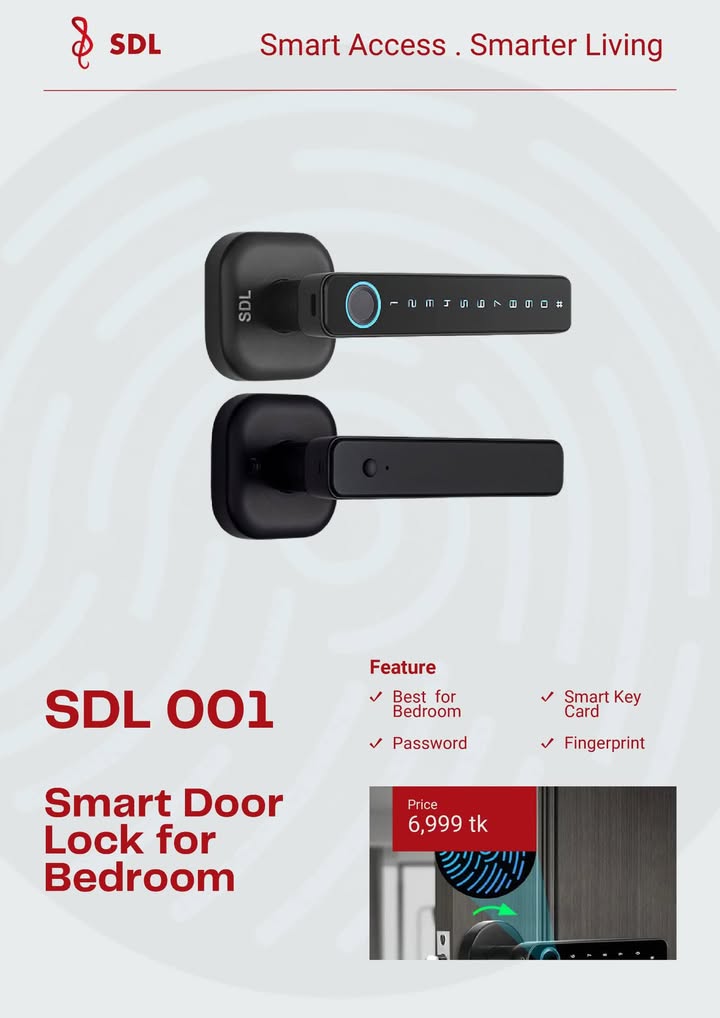 Upgrade your home security with the SDL 001 Smart Door Lock, specially designed for bedroom doors. This modern and stylish smart lock offers a perfect combination of safety, convenience, and smart access control for everyday use. No more worries about lost keys—unlock your door easily using multiple smart options.